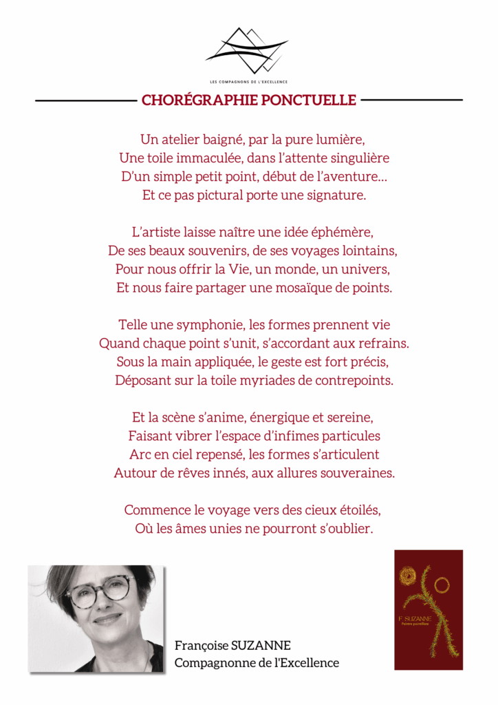Face à une œuvre de Françoise SUZANNE, la quête primordiale devient une raison d’admirer. Et cette question se symbolise, point après point, formes après figures, et à chaque tableau pour s’éclaircir et offrir de la lumière à chacun selon sa perception et illuminer l’abysse de sa recherche.